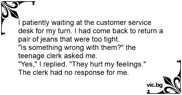 I patiently waiting at the customer service desk for my turn. I had come back to return a pair of jeans that were too tight.