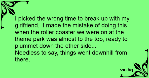 I picked the wrong time to break up with my girlfriend. I made the mistake of doing this when the roller coaster we were on at the theme park was almost to the top, ready to plummet down the other side...
