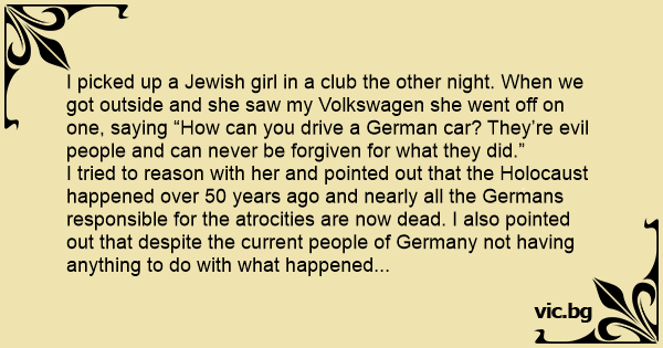 I picked up a Jewish girl in a club the other night. When we got outside and she saw my Volkswagen she went off on one, saying “How can you drive a German car? They’re evil people and can never be forgiven for what they did.”