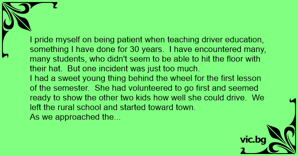 I pride myself on being patient when teaching driver education, something I have done for 30 years. I have encountered many, many students, who didn't seem to be able to hit the floor with their hat. But one incident was just too much.