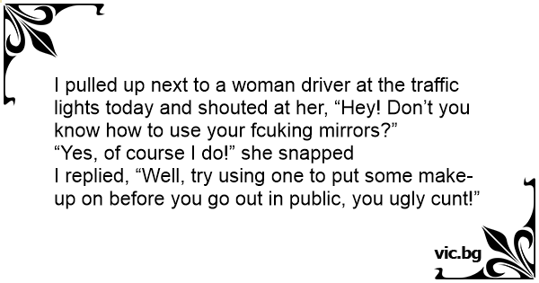 I pulled up next to a woman driver at the traffic lights today and shouted at her, “Hey! Don’t you know how to use your fсuкing mirrors?”