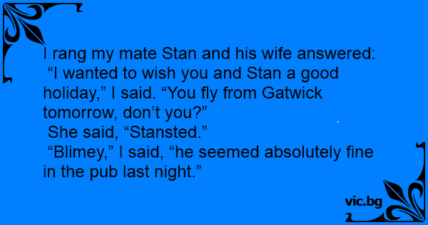 “I wanted to wish you and Stan a good holiday,” I said. “You fly from Gatwick tomorrow, don’t you?”