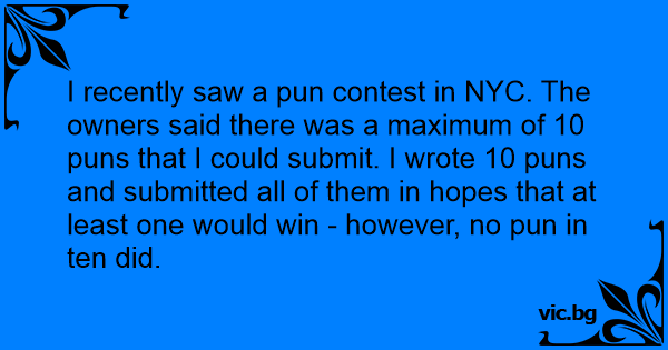 I recently saw a pun contest in NYC. The owners said there was a maximum of 10 puns that I could submit. I wrote 10 puns and submitted all of them in hopes that at least one would win - however, no pun in ten did.