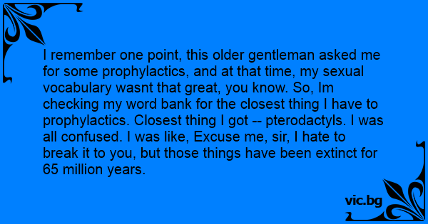 I remember one point, this older gentleman asked me for some prophylactics, and at that time, my sеxuаl vocabulary wasnt that great, you know. So, Im checking my word bank for the closest thing I have to prophylactics. Closest thing I got -- pterodactyls. I was all confused. I was like, Excuse me, sir, I hate to break it to you, but those things have been extinct for 65 million years.