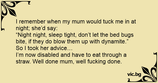 “Night night, sleep tight, don’t let the bed bugs bite, if they do вlоw them up with dynamite.”