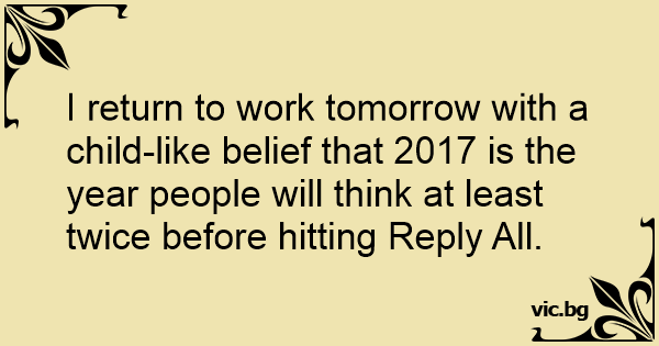 I return to work tomorrow with a child-like belief that 2017 is the year people will think at least twice before hitting Reply All.