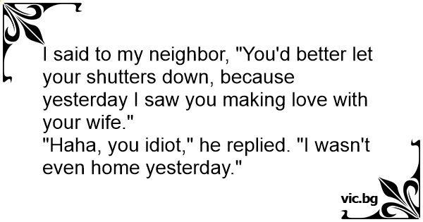 I said to my neighbor, "You'd better let your shutters down, because yesterday I saw you making love with your wife."