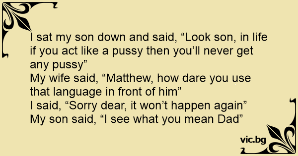 I sat my son down and said, “Look son, in life if you act like a рussy then you’ll never get any рussy” My wife said, “Matthew, how dare you use that language in front of him” I said, “Sorry dear, it won’t happen again” My son said, “I see what you mean Dad”
