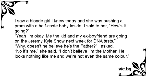 “Yeah I’m okay. Me the kid and my ex-boyfriend are going on the Jeremy Kyle Show next week for DNA tests.”