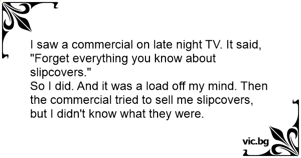 So I did. And it was a load off my mind. Then the commercial tried to sell me slipcovers, but I didn't know what they were.