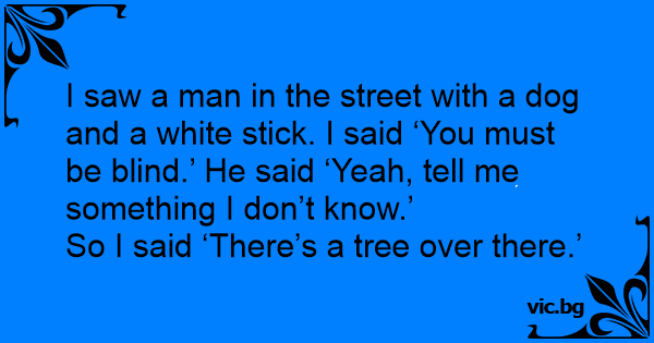I saw a man in the street with a dog and a white stick. I said ‘You must be blind.’ He said ‘Yeah, tell me something I don’t know.’