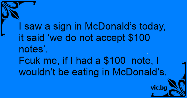 I saw a sign in McDonald’s today, it said ‘we do not accept $100 notes’.