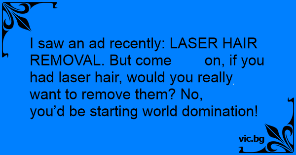 I saw an ad recently: LASER HAIR REMOVAL. But come on, if you had laser hair, would you really want to remove them? No, you’d be starting world dомinатiоn!
