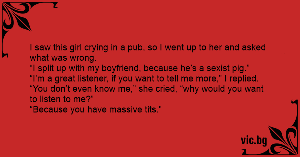 I saw this girl crying in a pub, so I went up to her and asked what was wrong.