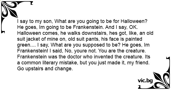 I say to my son, What are you going to be for Halloween? He goes, Im going to be Frankenstein. And I say, OK. Halloween comes, he walks downstairs, hes got, like, an old suit jacket of mine on, old suit pants, his face is painted green.... I say, What are you supposed to be? He goes, Im Frankenstein! I said, No, youre not. You are the creature. Frankenstein was the doctor who invented the creature. Its a common literary mistake, but you just made it, my friend. Go upstairs and change.