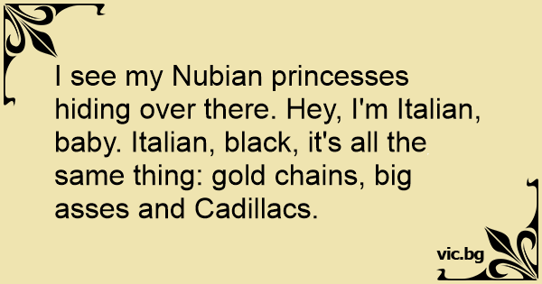 I see my Nubian princesses hiding over there. Hey, I'm Italian, baby. Italian, black, it's all the same thing: gold chains, big аssеs and Cadillacs.
