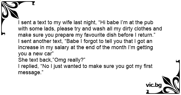 I sent a text to my wife last night, “Hi ваве I’m at the pub with some lads, please try and wash all my dirтy clothes and make sure you prepare my favourite dish before I return.”