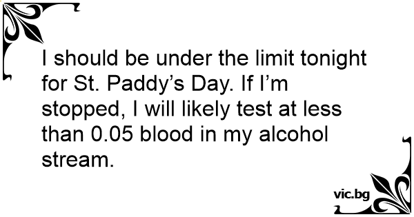 I should be under the limit tonight for St. Раddy’s Day. If I’m stopped, I will likely test at less than 0.05 blood in my alcohol stream.