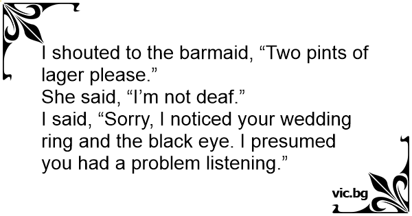 I said, “Sorry, I noticed your wedding ring and the black eye. I presumed you had a problem listening.”