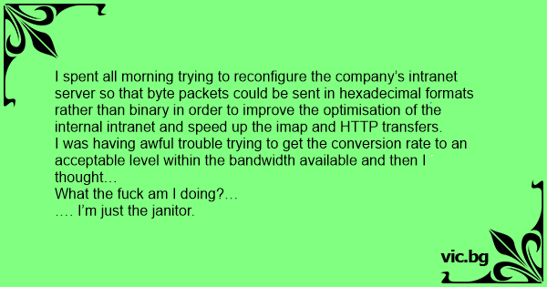 I spent all morning trying to reconfigure the company’s intranet server so that byte packets could be sent in hexadecimal formats rather than binary in order to improve the optimisation of the internal intranet and speed up the imap and HTTP transfers.