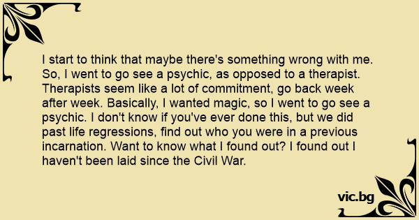 I start to think that maybe there's something wrong with me. So, I went to go see a psychic, as opposed to a therapist. Therapists seem like a lot of commitment, go back week after week. Basically, I wanted magic, so I went to go see a psychic. I don't know if you've ever done this, but we did past life regressions, find out who you were in a previous incarnation. Want to know what I found out? I found out I haven't been laid since the Civil War.