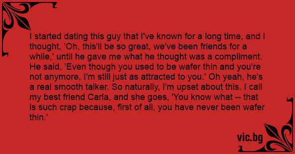 I started dating this guy that I've known for a long time, and I thought, 'Oh, this'll be so great, we've been friends for a while,' until he gave me what he thought was a compliment. He said, 'Even though you used to be wafer thin and you're not anymore, I'm still just as attracted to you.' Oh yeah, he's a real smooth talker. So naturally, I'm upset about this. I call my best friend Carla, and she goes, 'You know what -- that is such сrар because, first of all, you have never been wafer thin.'