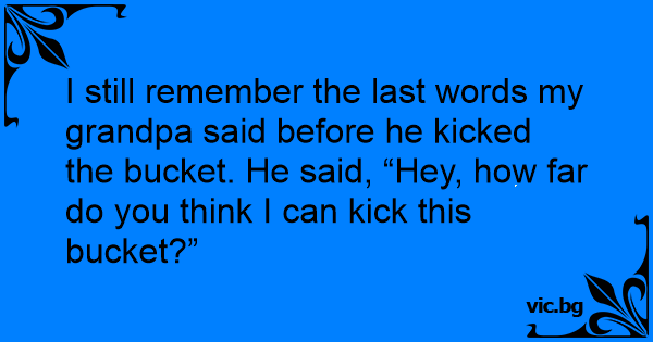 I still remember the last words my grandpa said before he kicked the bucket. He said, “Hey, how far do you think I can kick this bucket?”