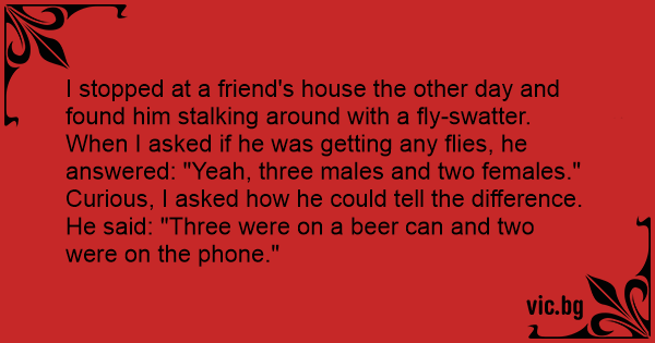 — Сеня, шо ти бігаєш, як ідіот, з цією мухобійкою? — Роза, не заважай міні! Я вбив-таки п'ять мух... Три самці і дві самки! — Я тебе благаю! Як ти дізнався?! — А шо тут дізнаватися? Три — на банці з пивом, а дві — на телефоні...