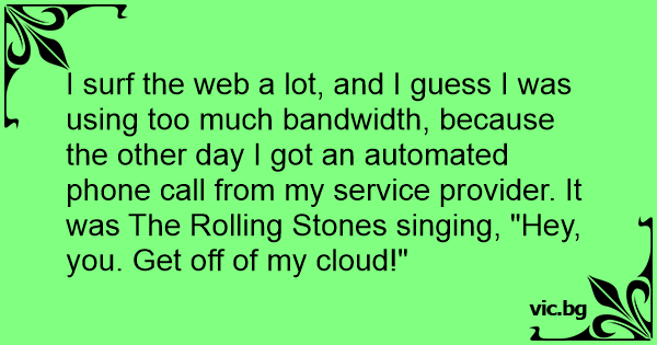 I surf the web a lot, and I guess I was using too much bandwidth, because the other day I got an automated phone call from my service provider. It was The Rolling Stones singing, "Hey, you. Get off of my cloud!"