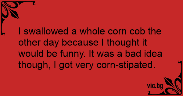 I swallowed a whole corn cob the other day because I thought it would be funny. It was a bad idea though, I got very corn-stipated.