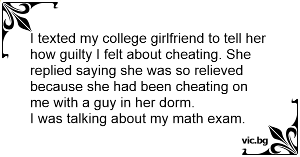 I texted my college girlfriend to tell her how guilty I felt about cheating. She replied saying she was so relieved because she had been cheating on me with a guy in her dorm.