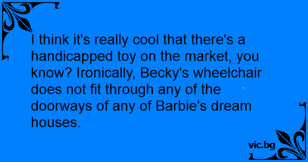 I think it's really cool that there's a handicapped toy on the market, you know? Ironically, Becky's wheelchair does not fit through any of the doorways of any of Barbie's dream houses.