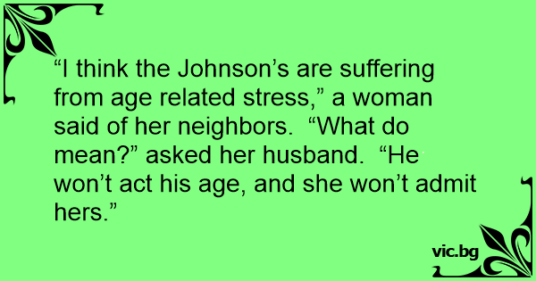 “I think the Johnson’s are suffering from age related stress,” a woman said of her neighbors. “What do mean?” asked her husband. “He won’t act his age, and she won’t admit hers.”