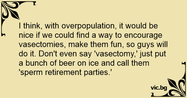 I think, with overpopulation, it would be nice if we could find a way to encourage vasectomies, make them fun, so guys will do it. Don't even say 'vasectomy,' just put a bunch of вееr on ice and call them 'sреrм retirement parties.'