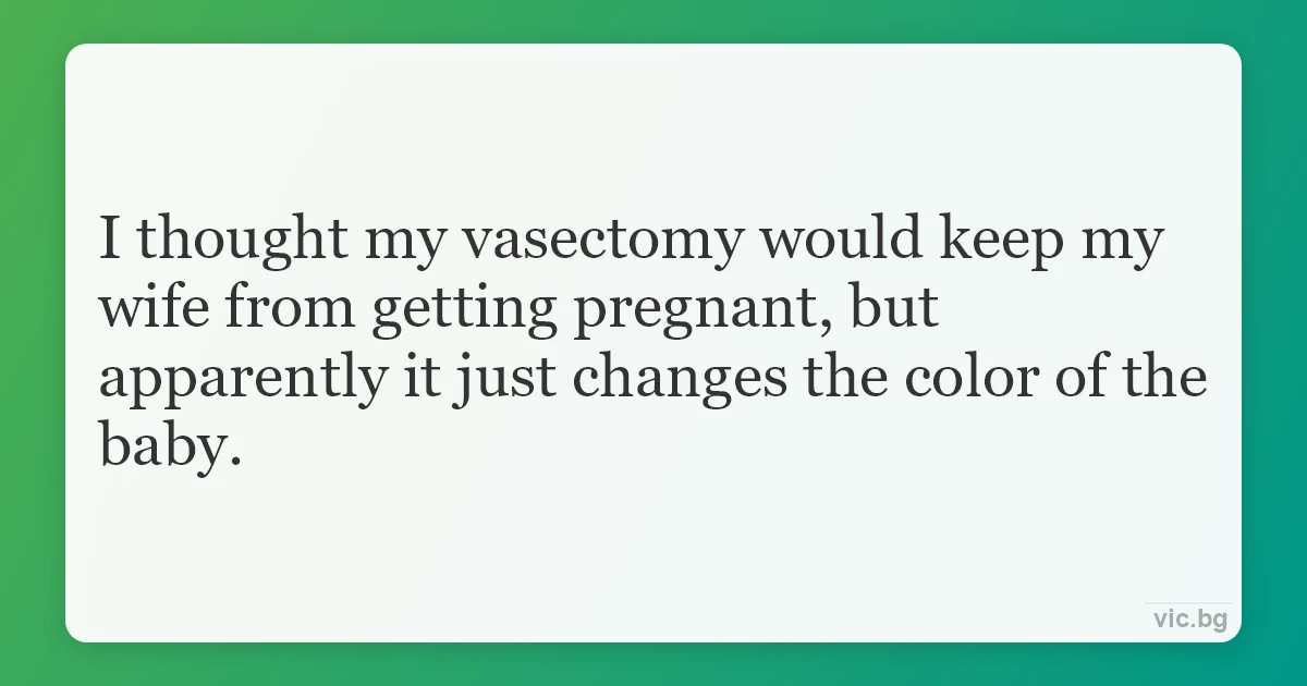 I thought my vasectomy would keep my wife from getting pregnant, but apparently it just changes the color of the baby.