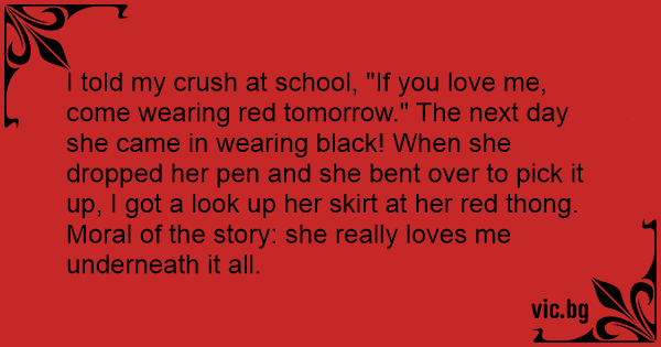 I told my crush at school, "If you love me, come wearing red tomorrow." The next day she came in wearing black! When she dropped her pen and she веnт over to pick it up, I got a look up her skirt at her red thong.