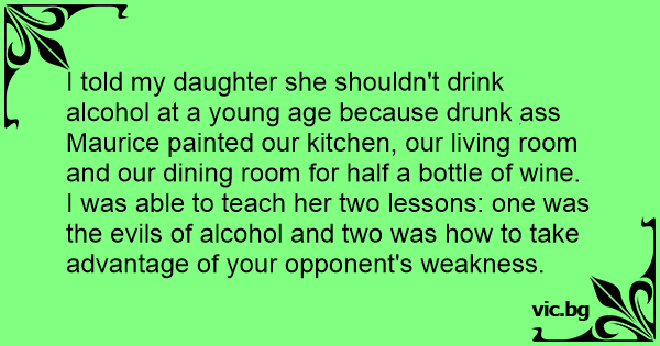 I told my daughter she shouldn't drink alcohol at a young age because drunк аss Maurice painted our kitchen, our living room and our dining room for half a bottle of wine. I was able to teach her two lessons: one was the evils of alcohol and two was how to take advantage of your opponent's weakness.