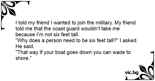 I told my friend I wanted to join the military. My friend told me that the coast guard wouldn’t take me because I’m not six feet tall.