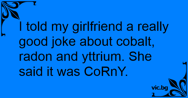 I told my girlfriend a really good joke about cobalt, radon and yttrium. She said it was CoRnY.