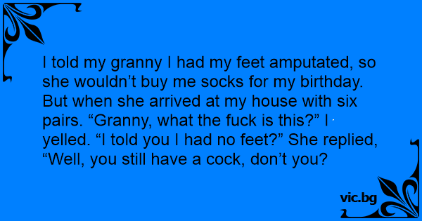 I told my granny I had my feet amputated, so she wouldn’t buy me socks for my birthday. But when she arrived at my house with six pairs. “Granny, what the fuск is this?” I yelled. “I told you I had no feet?” She replied, “Well, you still have a соск, don’t you?