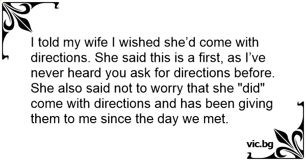 I told my wife I wished she’d come with directions. She said this is a first, as I’ve never heard you ask for directions before.<br />She also said not to worry that she "did" come with directions and has been giving them to me since the day we met.