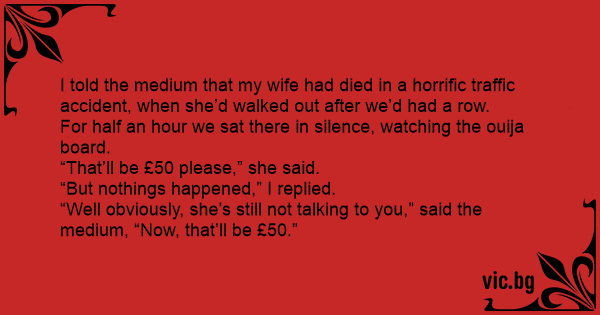 “Well obviously, she’s still not talking to you,” said the medium, “Now, that’ll be £50.”