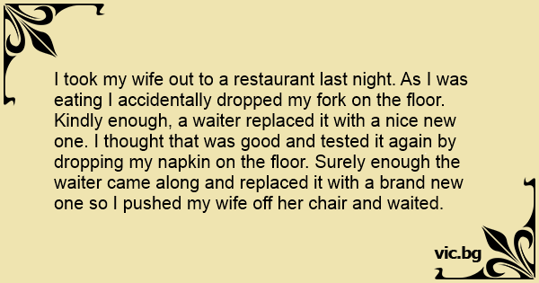 I took my wife out to a restaurant last night. As I was eating I accidentally dropped my fork on the floor. Kindly enough, a waiter replaced it with a nice new one. I thought that was good and tested it again by dropping my napkin on the floor. Surely enough the waiter came along and replaced it with a brand new one so I pushed my wife off her chair and waited.