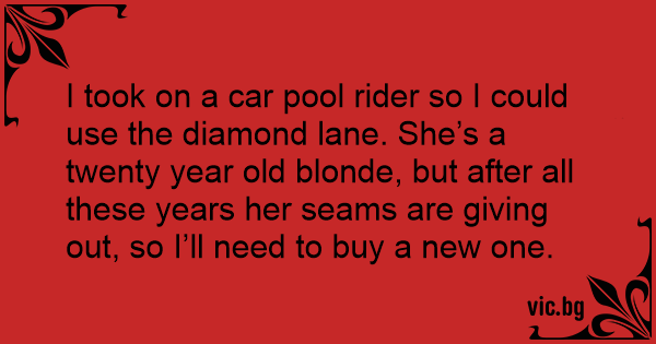 I took on a car pool rider so I could use the diamond lane. She’s a twenty year old blonde, but after all these years her seams are giving out, so I’ll need to buy a new one.