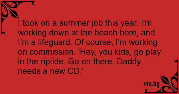 I took on a summer job this year. I'm working down at the beach here, and I'm a lifeguard. Of course, I'm working on commission. 'Hey, you kids, go play in the riptide. Go on there. Daddy needs a new CD.'