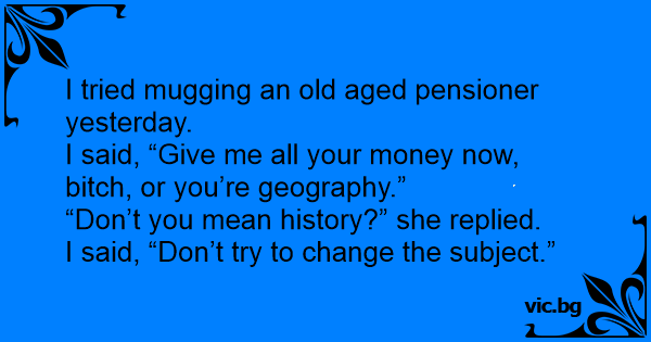 I said, “Give me all your money now, вiтсh, or you’re geography.”