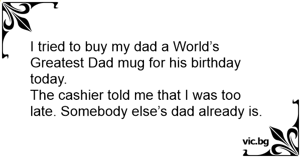 I tried to buy my dad a World’s Greatest Dad mug for his birthday today.<br />The cashier told me that I was too late. Somebody else’s dad already is.