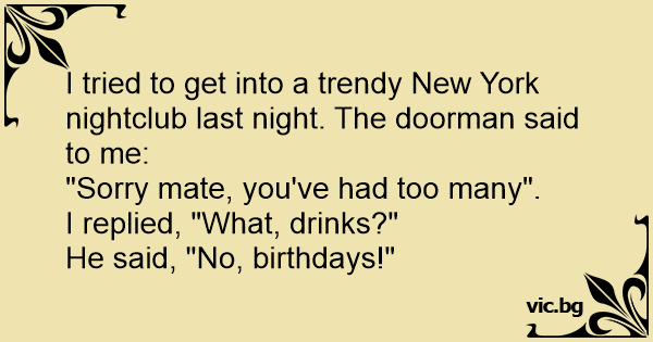 Пробвах снощи да вляза в една дискотека. Портиера ме спря и вика: - Съжалявам пич, имаш прекалено много! - Питиета ли? - Рождени дни...