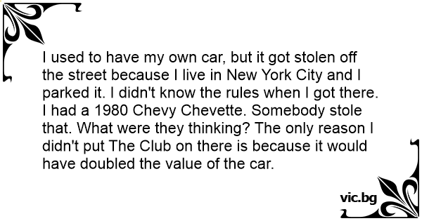 I used to have my own car, but it got stolen off the street because I live in New York City and I parked it. I didn't know the rules when I got there. I had a 1980 Chevy Chevette. Somebody stole that. What were they thinking? The only reason I didn't put The Club on there is because it would have doubled the value of the car.