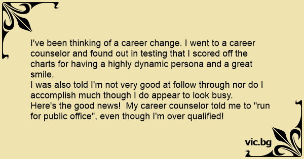 Here's the good news! My career counselor told me to "run for public office", even though I'm over qualified!